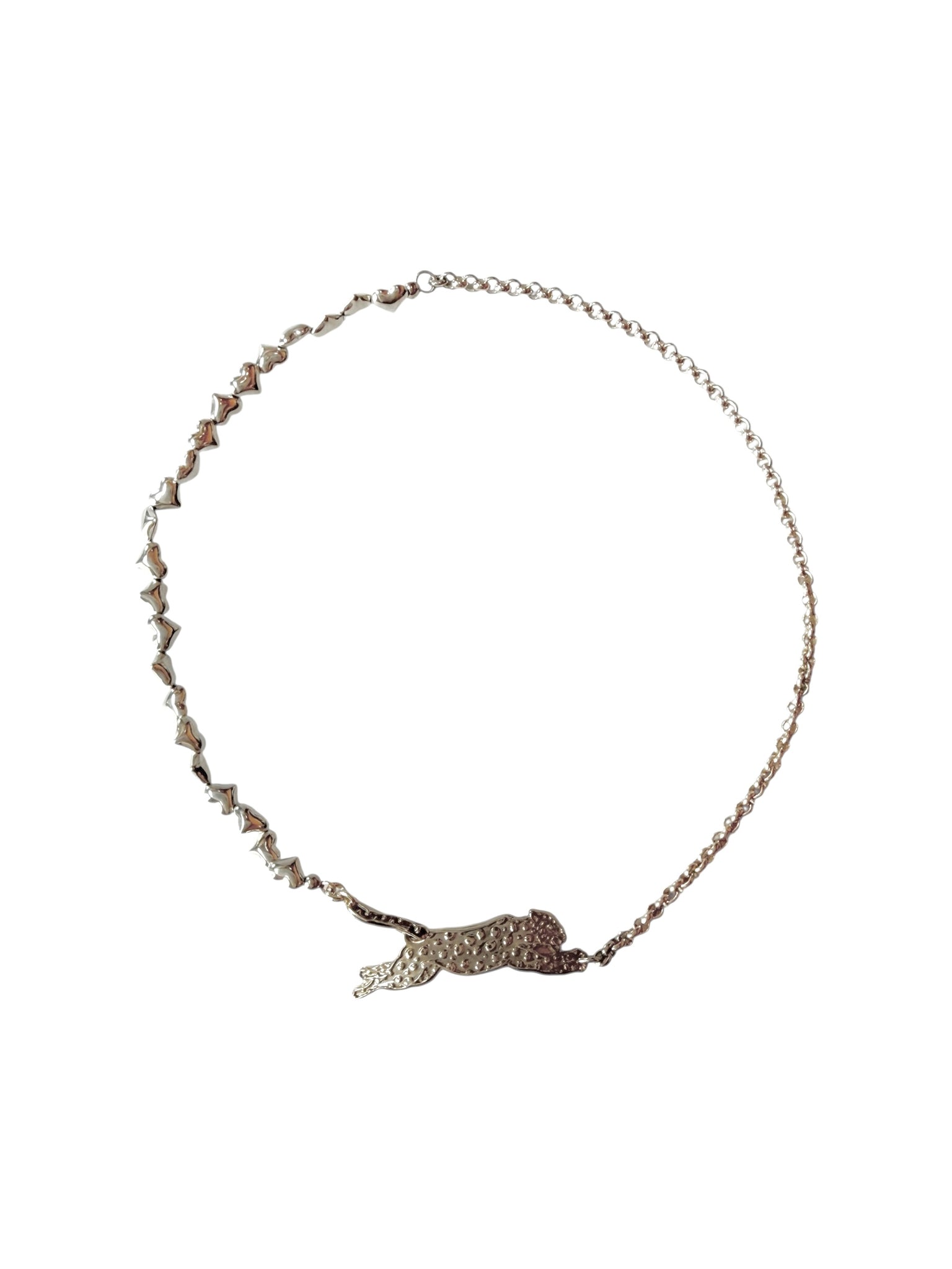 存在感のあるシンプルなチェーンとパンチがきいたハートビーズのコンビに、留め具はLEOPARD hookを合わせました。