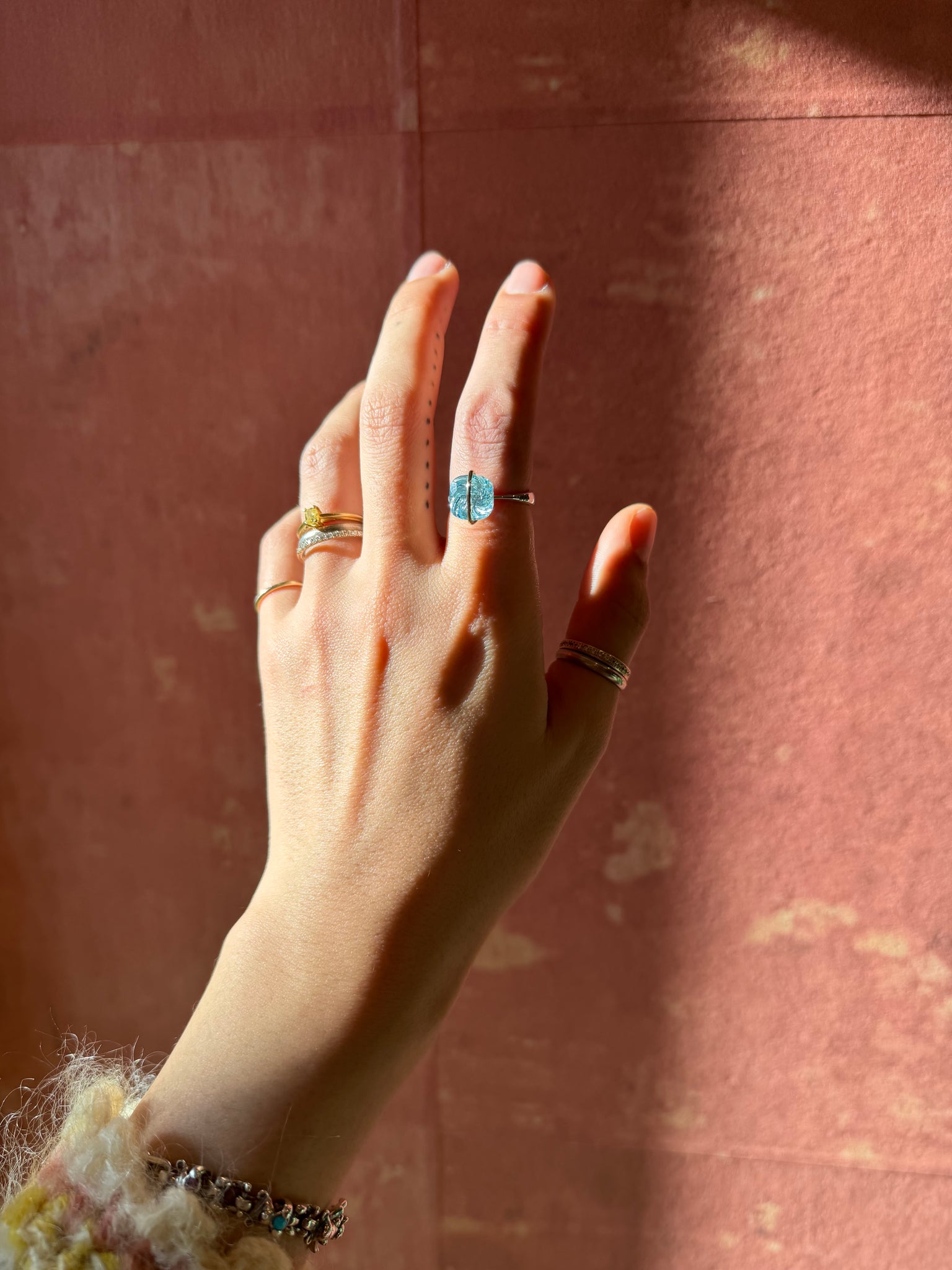 パラセッティングでは18金ゴールドのバーでジェムストーンをホチキスのように固定することで、新しい魅力を引き出します。